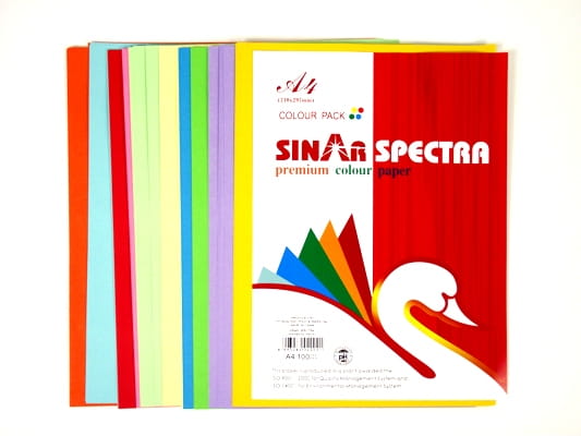 Zestaw 100 kolorowych arkuszy papierowych w rozmiarze A4.