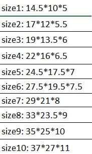 size8: 33*23.5*9, size9: 35*25*10, size10: 37*27*11