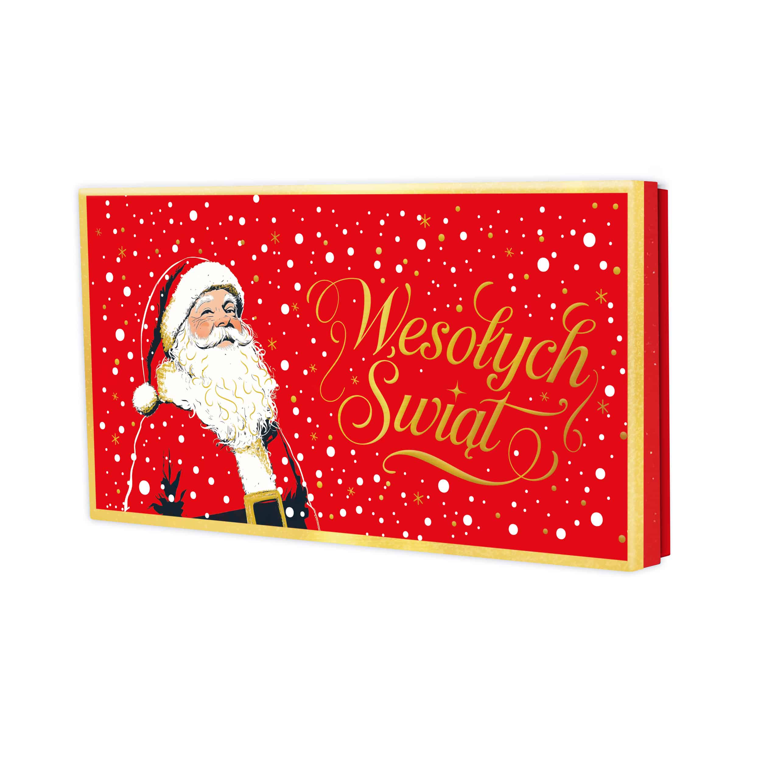 Świąteczne pudełko prezentowe w rozmiarze DL to eleganckie opakowanie stworzone z myślą o wyjątkowych upominkach. Bogato zdobione, z połyskującym złoceniem i efektowną grafiką przedstawiającą Mikołaja w klasycznej, ciepłej odsłonie, idealnie wpisuje się w klimat Bożego Narodzenia.